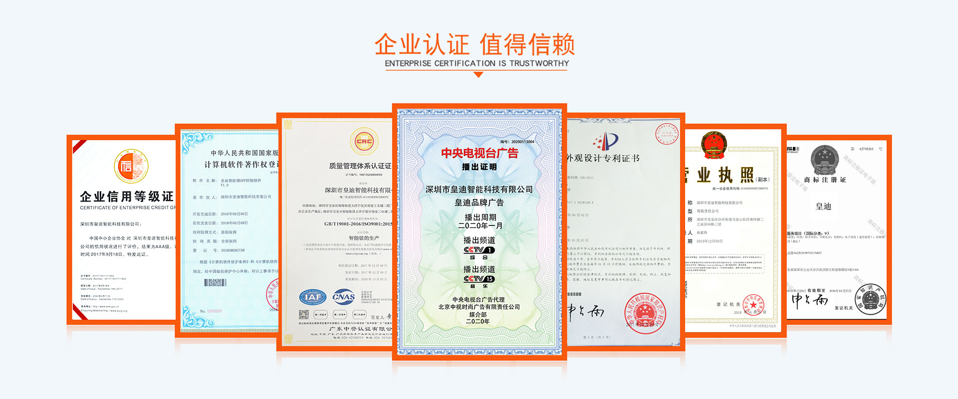 深圳市皇迪智能科技有限公司,是一家集產品研發、制造、銷售、安裝、售后于一體的全產業鏈公司,我司專注于酒店刷卡鎖、公寓藍牙密碼鎖、電子鎖、密碼鎖研發,生產,銷售.是國家高新技術企業,公司已通過ISO9001/2015標準認證,并擁有多項國家實用新型專利、外觀專利及計算機軟件著作權; 皇迪玻璃門鎖廠家一直秉承“以顧客為中心,以人為本,長期艱苦奮斗”的經營理念,為全球每一位消費者提供舒適,便捷,安全的高品質生活。